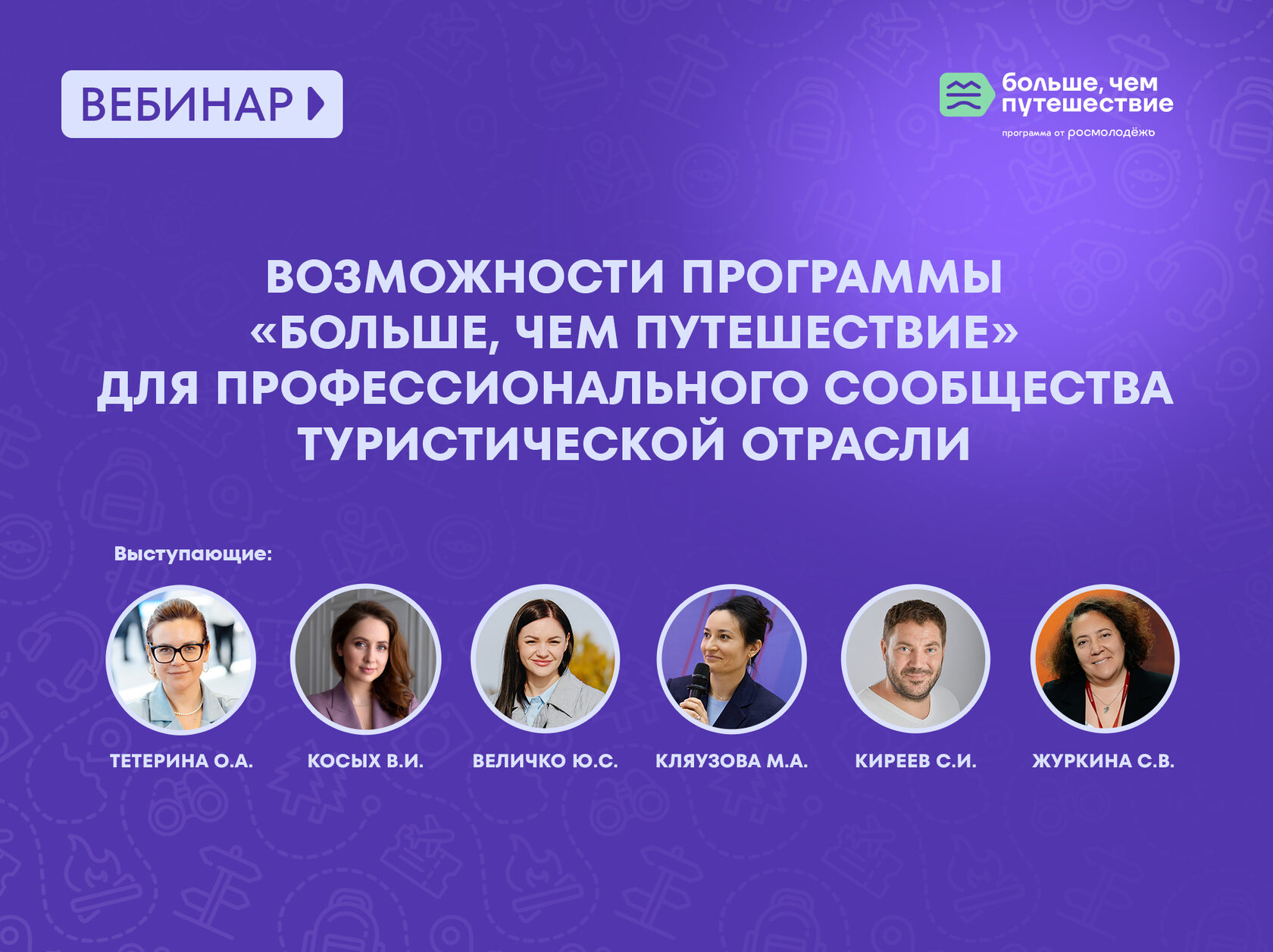 На портале Profi.Travel состоялся вебинар «Возможности программы “Больше, чем путешествие” для профессионального сообщества туристической отрасли», в ходе которого команда программы Росмолодёжи «Больше, чем путешествие» рассказала о ее стандарте, истории и новых возможностях.