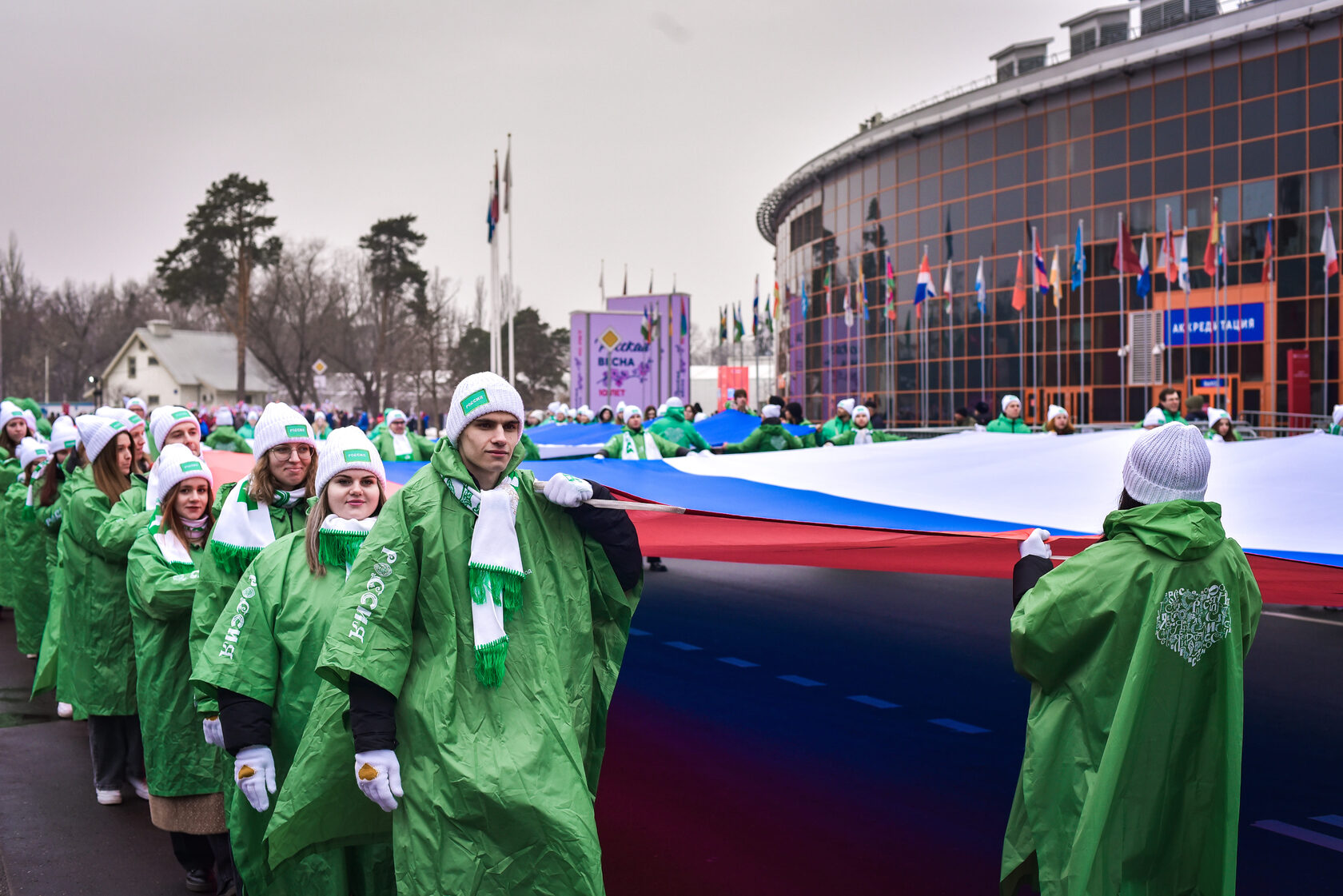 Процессия во главе с духовым оркестром стартовала от главной арки ВДНХ. В ходе шествия музыканты исполняли композиции, посвященные череде событий Русской весны. Участники прошли к павильону № 75, где экскурсоводы программы Росмолодёжи «Больше, чем путешествие» развернули 15-метровые флаги России, Севастополя и Республики Крым.