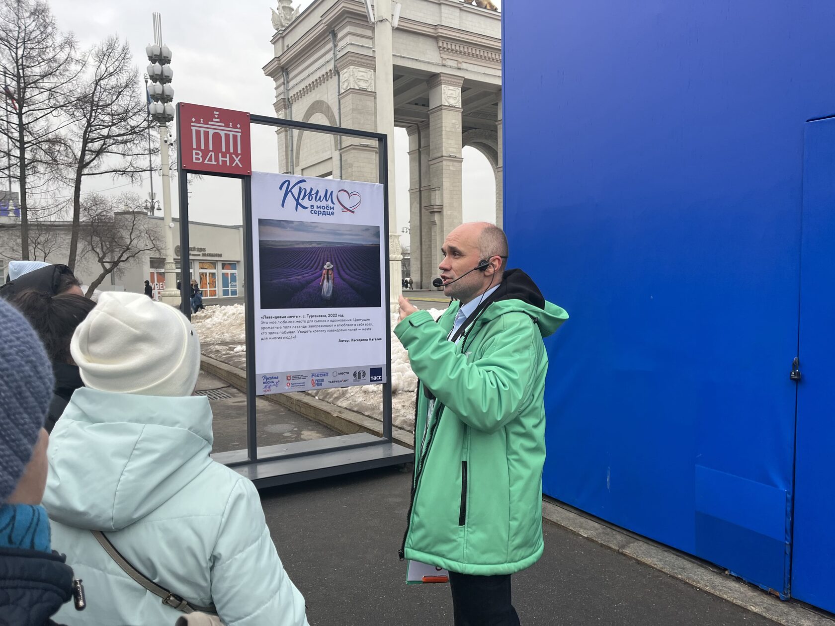 Первую экскурсию для гостей выставки провел крымчанин, экскурсовод программы Росмолодёжи «Больше, чем путешествие» на выставке “Россия” Сергей Самойлов.